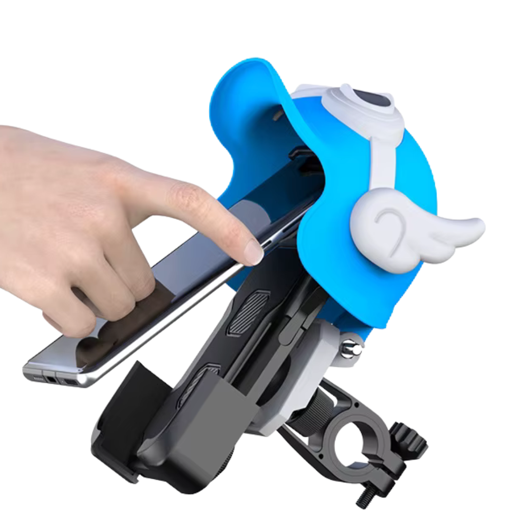 دوران 360 درجة يسمح بتحريك الهاتف في جميع الاتجاهات بسهولة حركة مرنة للأعلى والأسفل يثبت الهاتف بإحكام على الجادون لون الأزرق تركيب بسيط وسريع: مناسب لجميع أنواع الدراجات